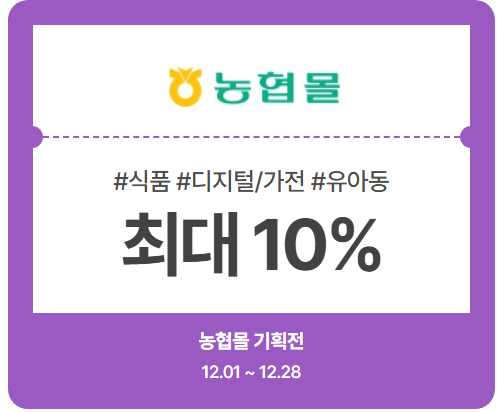 - 농·축·수산물 특별 할인전: 신선한 국내산 농축수산물을 최대 50% 할인된 가격에 구매 가능.